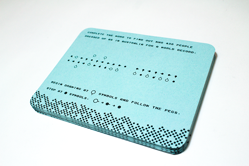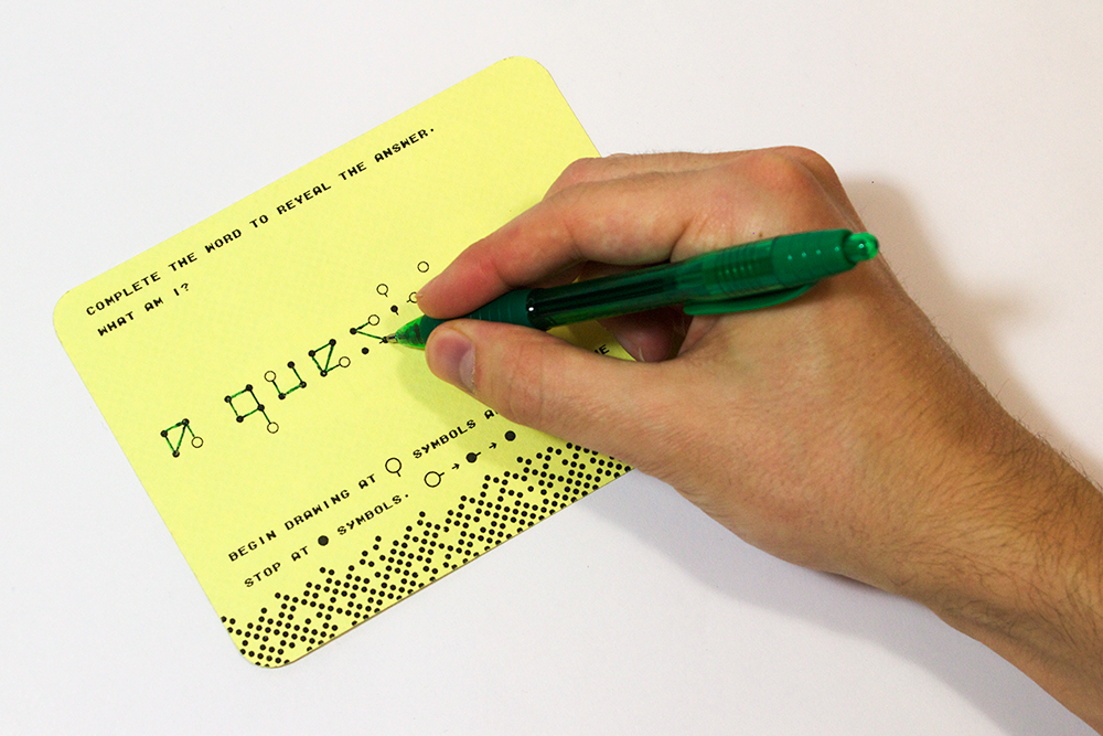 This system was inspired by pen and paper activities such as connect the dots and hangman, in which participants are required to interact with the mind and hand to solve the ultimate message. Growing up, many of us seem to lose the intimacy of directly interacting with the world around us. I wanted to create something that you could lose your mind into for a second, with an “aha” moment of satisfaction in the end that would connect people to the moment, as well as provide and enjoyable and engaging experience.